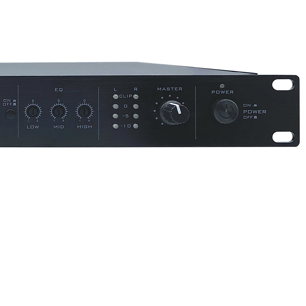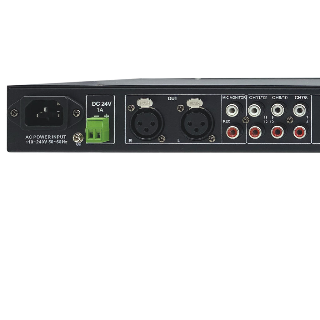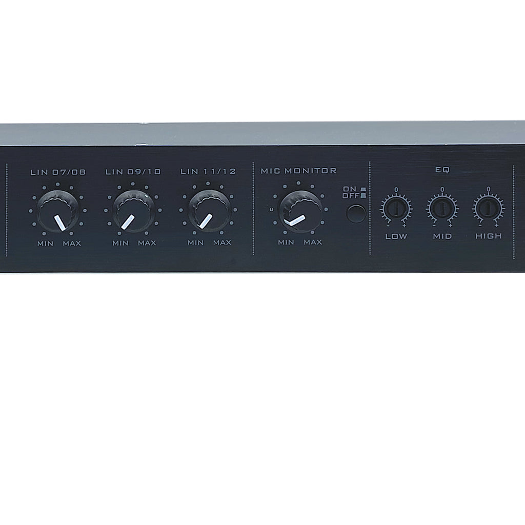 The MX12S is a 1U rack-mounted 12-channel mixer with 6 XLR combo inputs and 6 mono/3 stereo RCA inputs. The MX12S features a channel 1 priority, which can mute all other mic channels when a signal is present on Mic 1 channel, if desired. The front panel offers volume controls for channels 1 through 6 as well as stereo channels 7/8 to 11/12. Additionally, there are dedicated volume controls for Mic, Mono, and Master output. A master 3-band EQ offers cut/boost controls for high, mid, and low frequencies. Other features include balanced XLR outputs, mono ¼” output, and 18V-21V phantom power. The MX12S is well suited for live performance, karaoke, bars, clubs, studios, and more.
