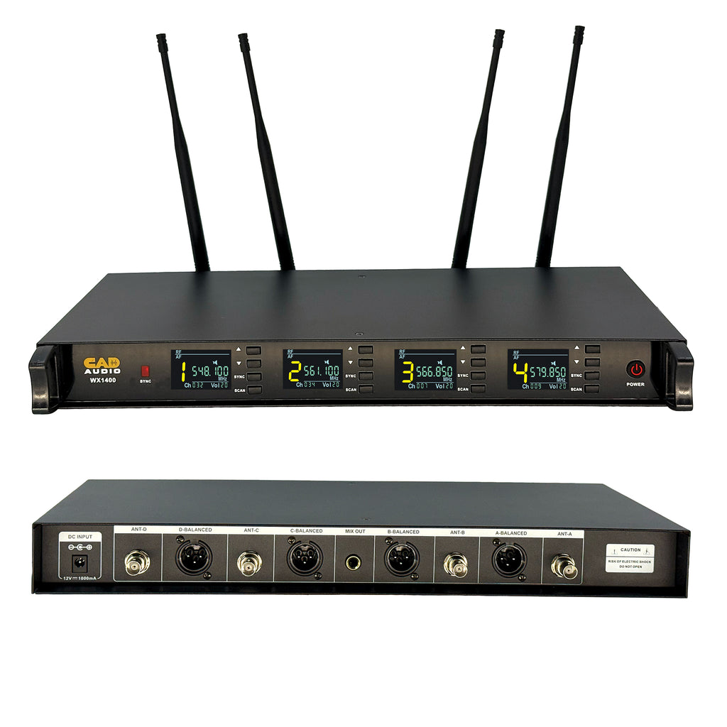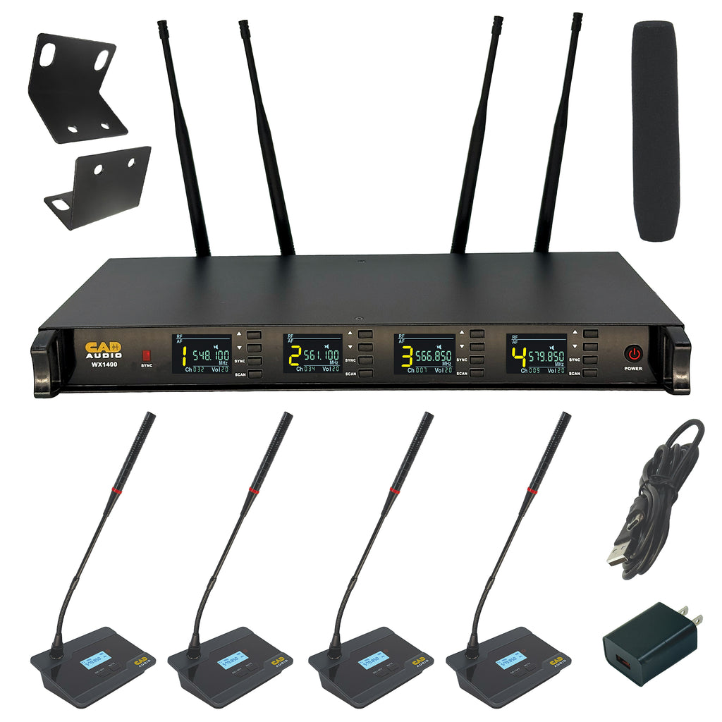 The WX1400GN is a Frequency Agile UHF Gooseneck Microphone System which operates in the 550-590mHz frequency band and includes 4 Gooseneck transmitters. features 100 channels for optimum clarity of signal. Auto-scan and IR sync functions make set up and channel-changing a breeze. Enjoy up to 8 hours of run time using two AA batteries, with a battery level indicator on the transmitter, so you’ll know when you need to replace them. The transmitter can also be powered by the on-board USB-C input, which can also recharge compatible batteries. Included gooseneck microphone features a red “active” indicator to avoid unwanted “hot mic” situations. Sturdy construction and included rack mounting hardware help ensure your equipment will stand up to even the toughest conditions. System includes receiver, transmitter, detachable gooseneck microphone with windscreen, and rack mounting supplies.